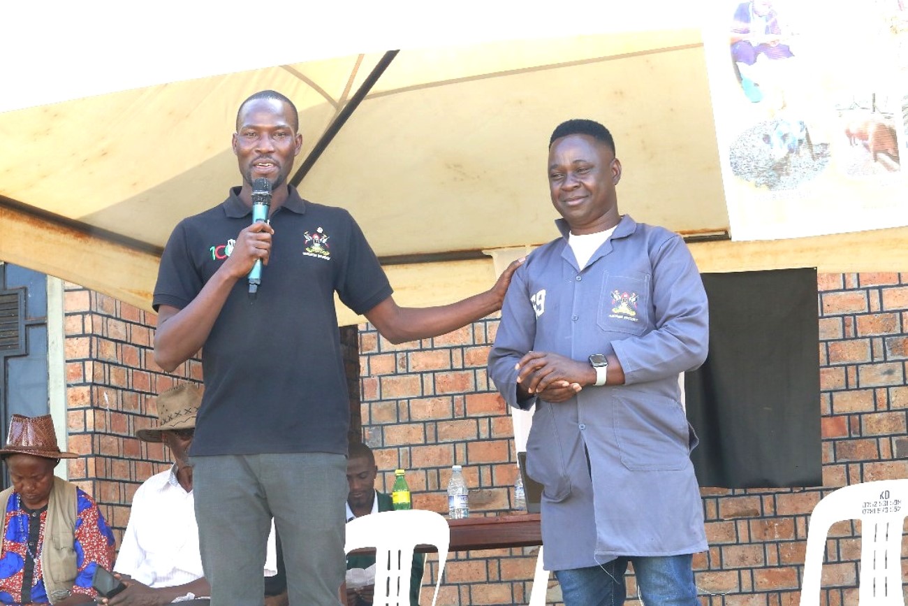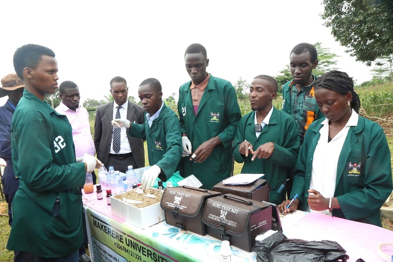Dr. Richard Miiro handing over soil test kits to Masaka DPMO, Mr. Ssekayi Godfrey during the Field Day activities at Green Valley Farm.CAES Field Days and End of Internship Programme