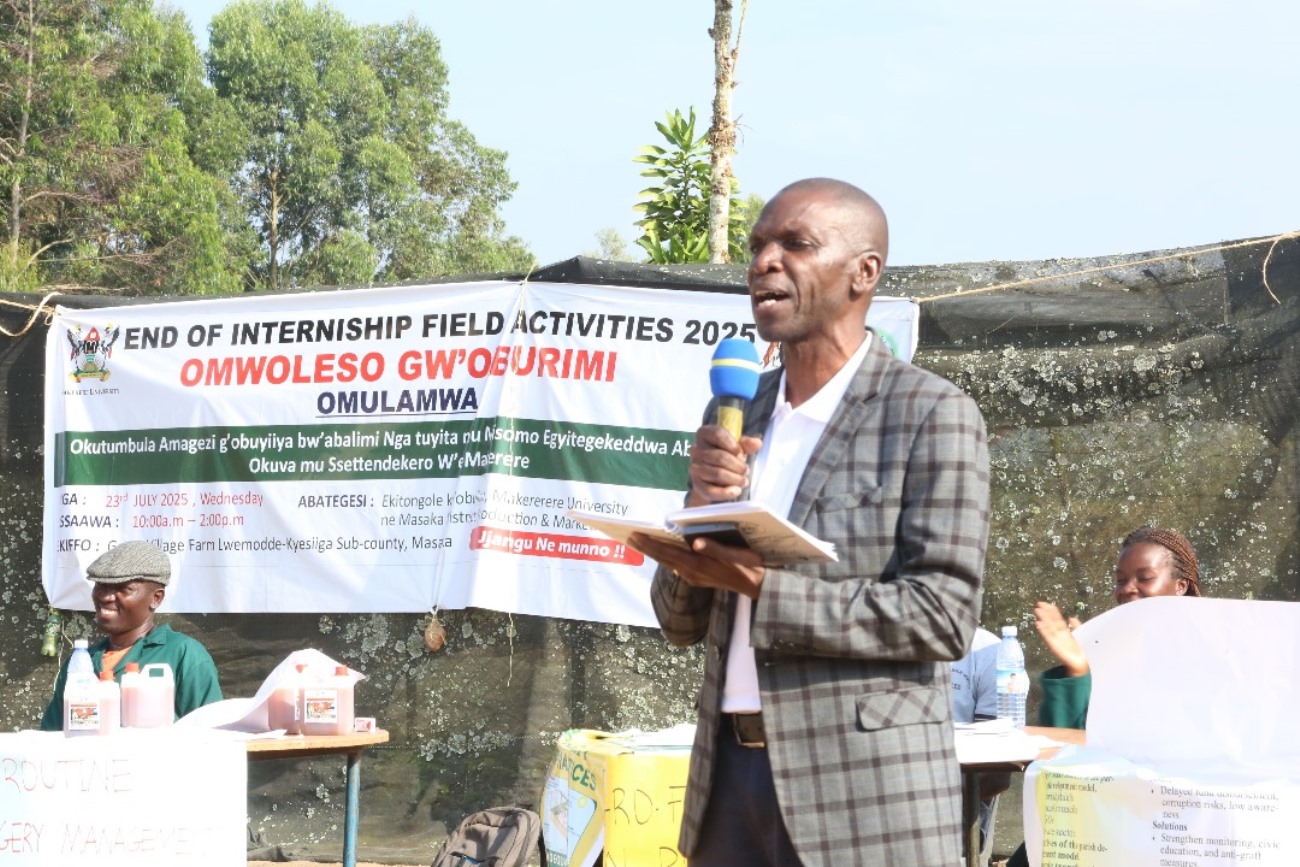 The LC5 Chairman of Masaka District, Mr. Andrew Battemyetto Lukyamuzi, appreciated the government for its continued support of internship programmes at the district. He highlighted the importance of establishing soil fertility centres within the district to improve crop productivity and ensure sustainable agricultural practices. Mr. Lukyamuzi also called for increased support in providing affordable agricultural inputs to farmers, alongside initiatives aimed at reskilling and empowering them to enhance agricultural output. He underscored the vital role of partnerships between universities and local communities, noting that such collaborations are essential for driving innovation and boosting agricultural production. He advised students to maintain discipline throughout their studies, and encouraged them to approach the job market with an open and adaptable mind-set.
