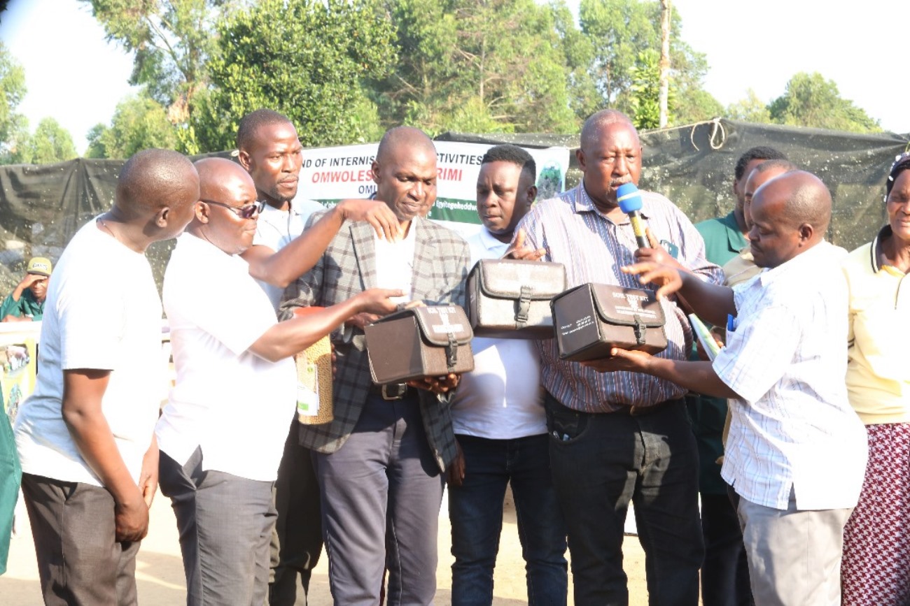 Dr. Richard Miiro handing over soil test kits to Masaka DPMO, Mr. Ssekayi Godfrey during the Field Day activities at Green Valley Farm.CAES Field Days and End of Internship Programme
