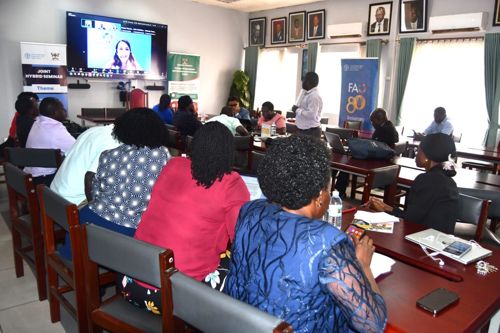 The College of Agricultural and Environmental Sciences, through the Department of Extension and Innovation Studies, in partnership with the Food and Agriculture Organization of the United Nations (FAO), hosted a high-level seminar focused on strengthening university capacity through the FAO TAP AIS e-Learning Course. The blended event (virtual and physical), convened a diverse group of stakeholders, including representatives from FAO, Makerere University, MAAIF, AFAAS, and UFAS.